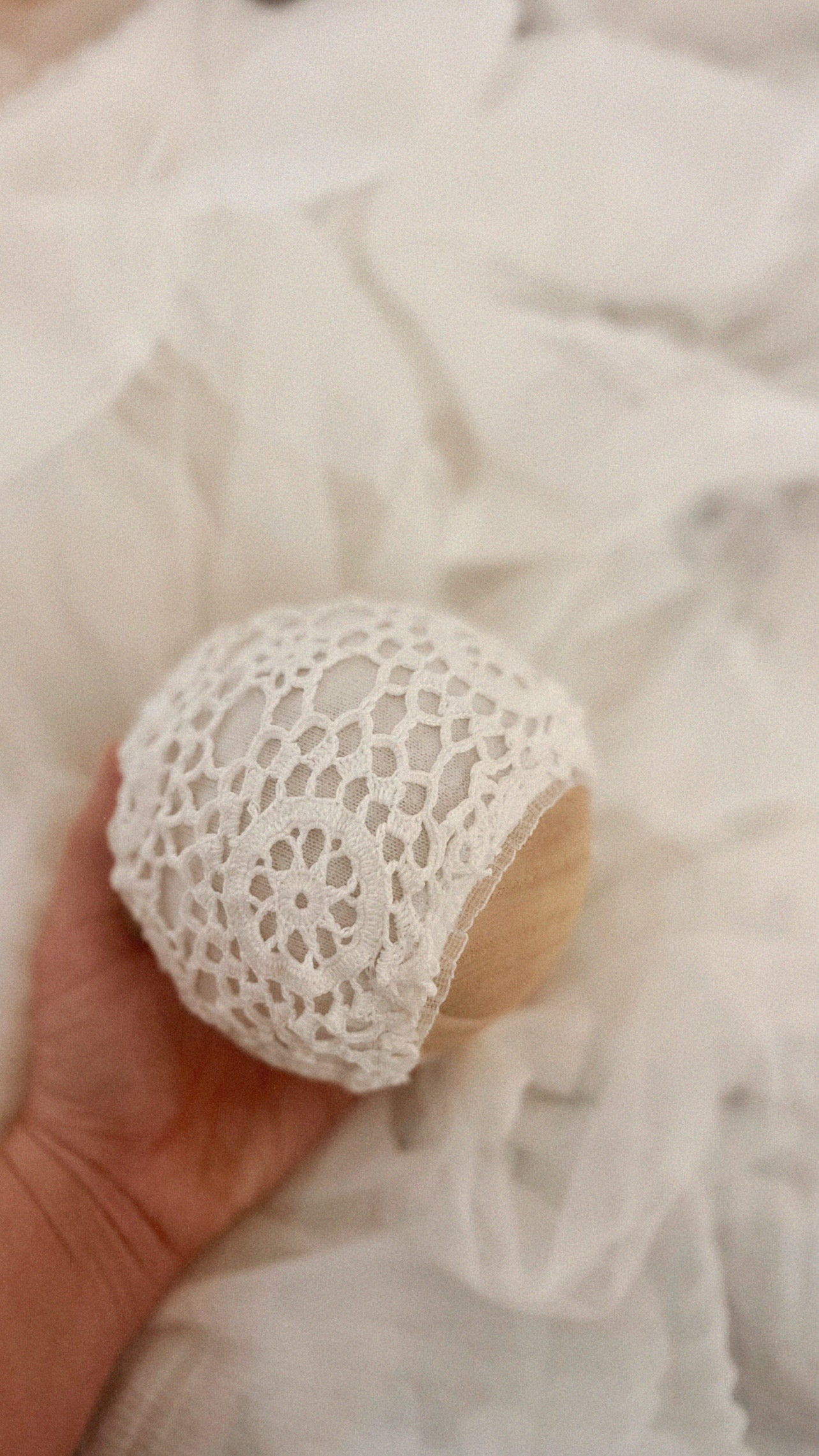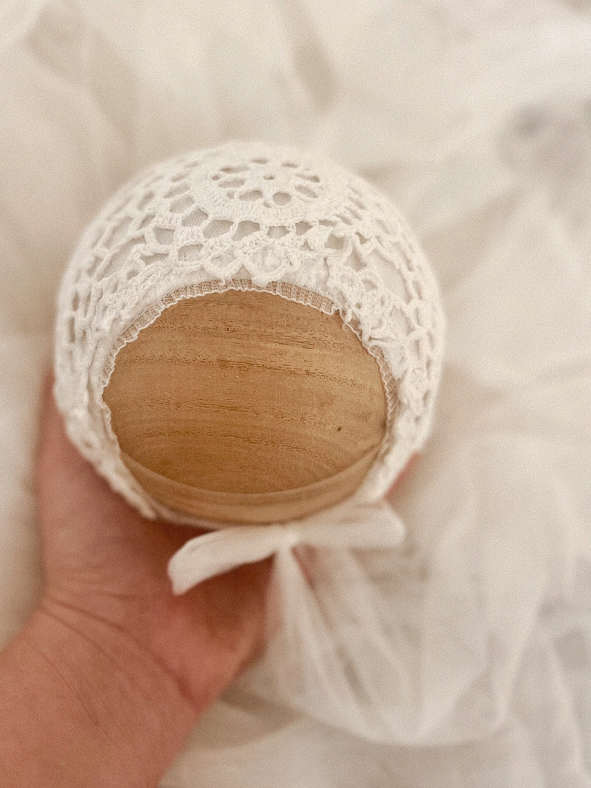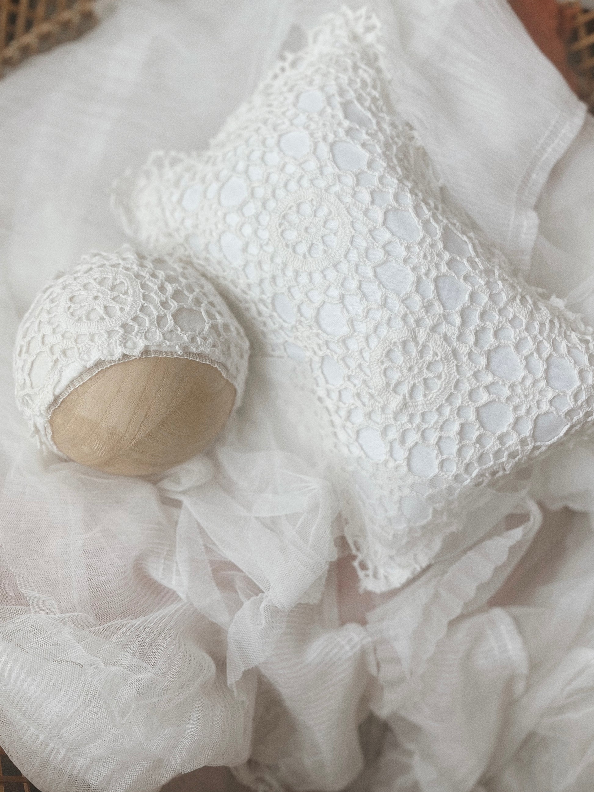 Vintage crochet lace bonnet with tiny tulle ruffle edge + matching pillow