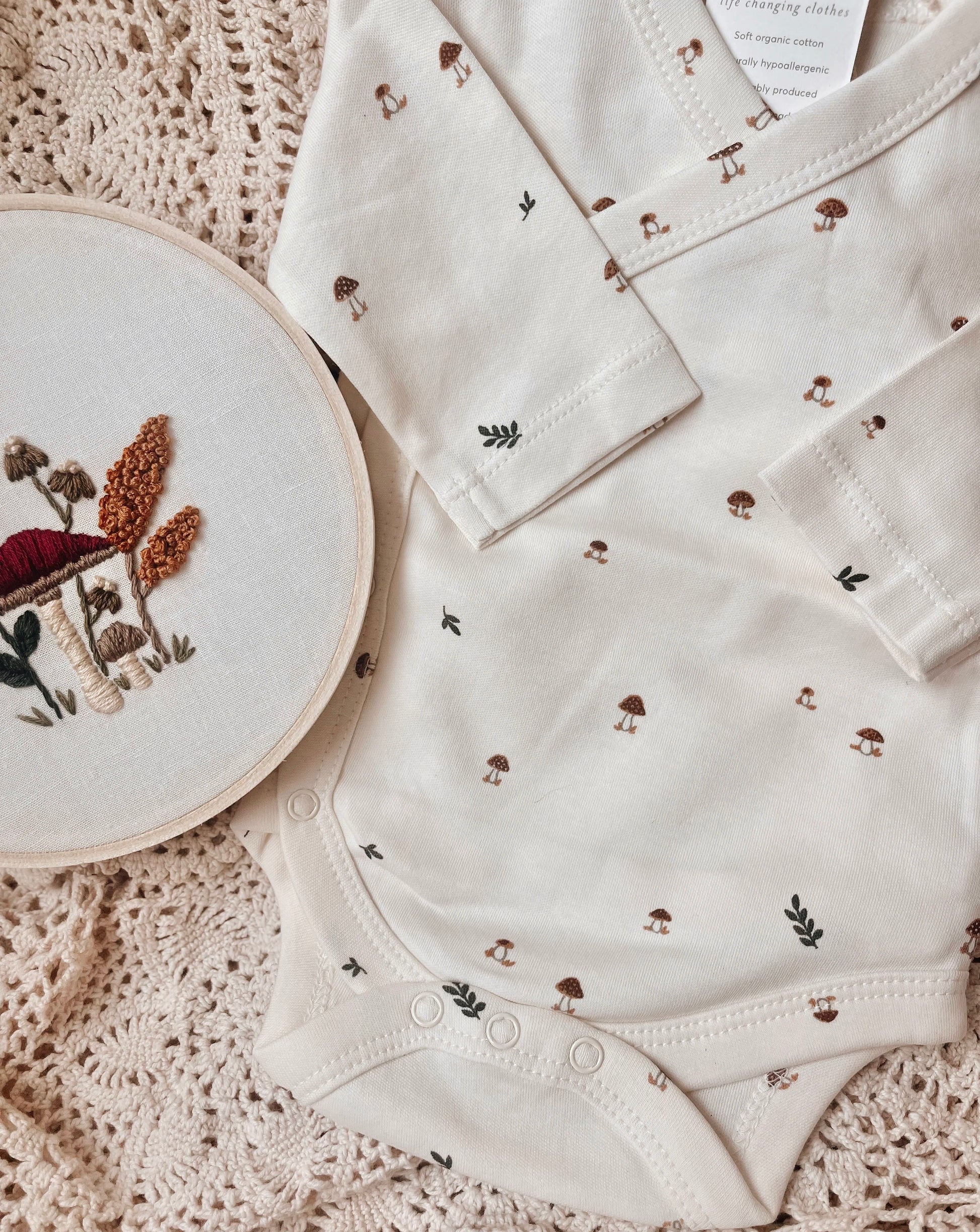 Organic cotton kimono style onesie. Pair it with the mushroom embroidery hoop for the cutest set.